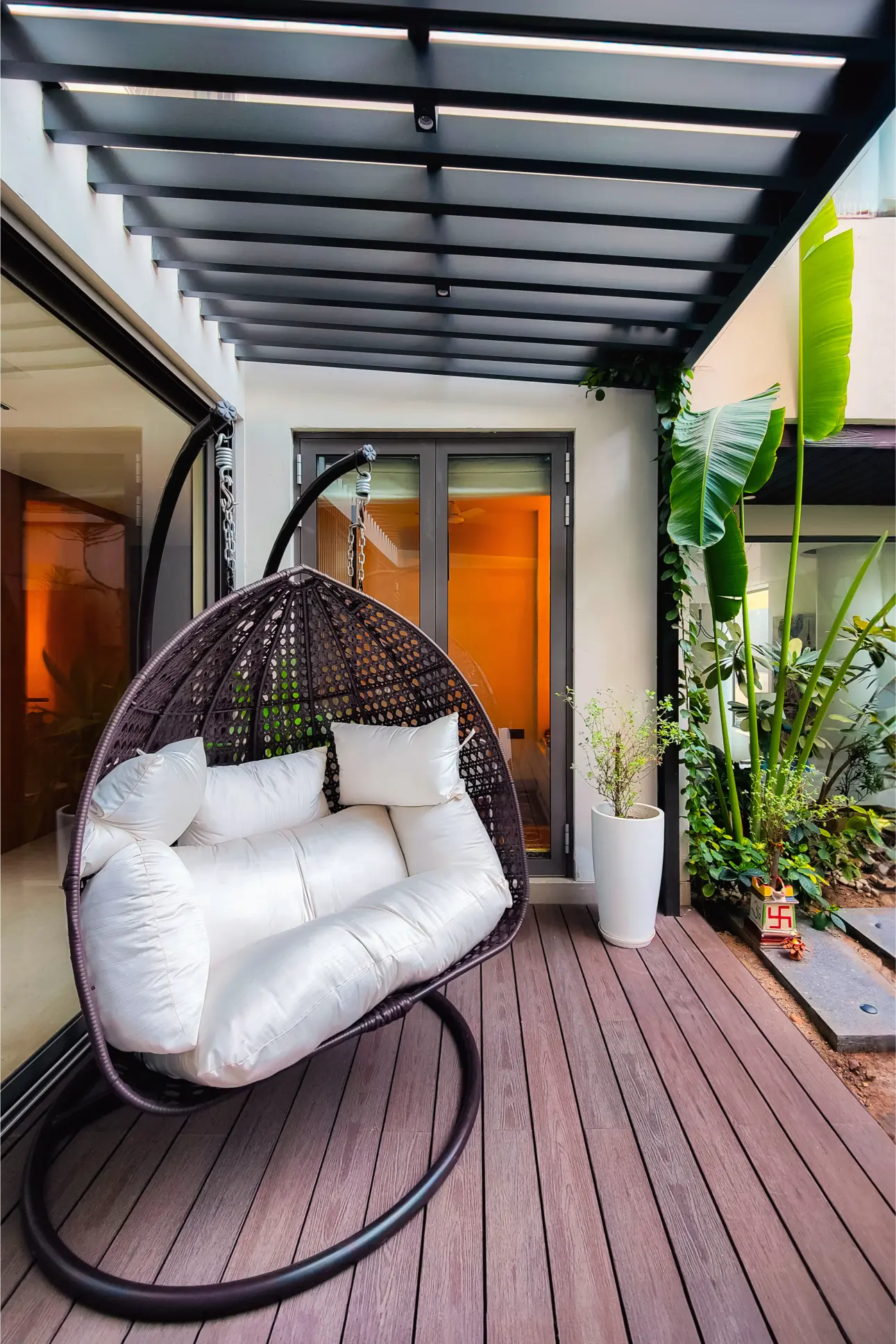 A private residence in Kota where nature and privacy meet in balance. Lightweight louvers line the exterior, veiling the home just enough while still letting light and air flow through. The result feels serene and composed, with the garden and facade speaking to each other gently.