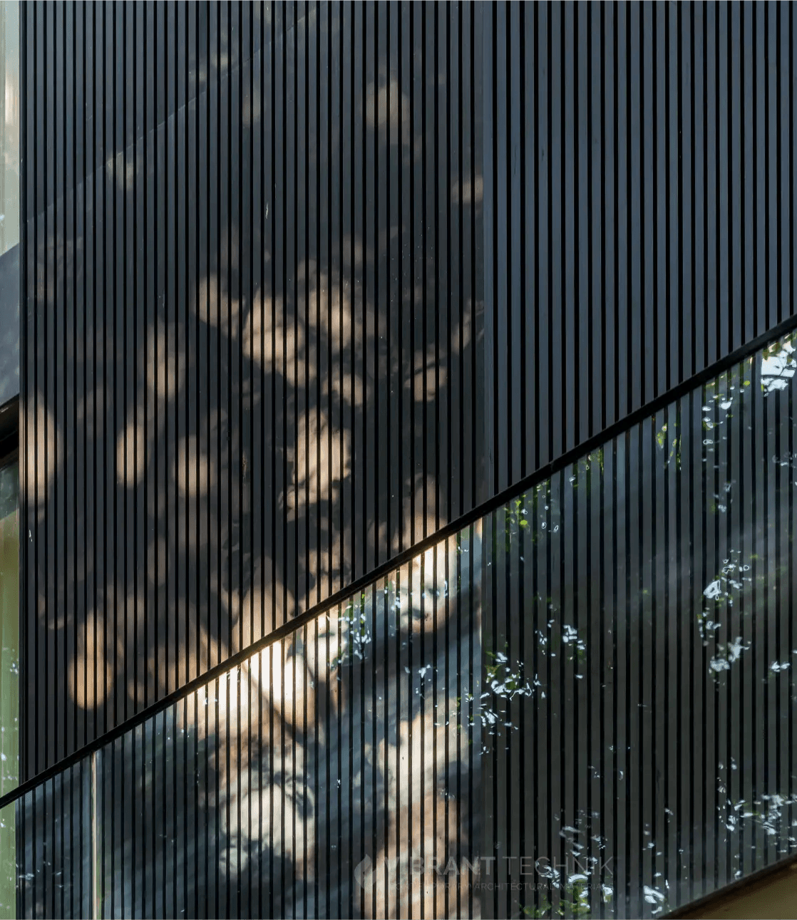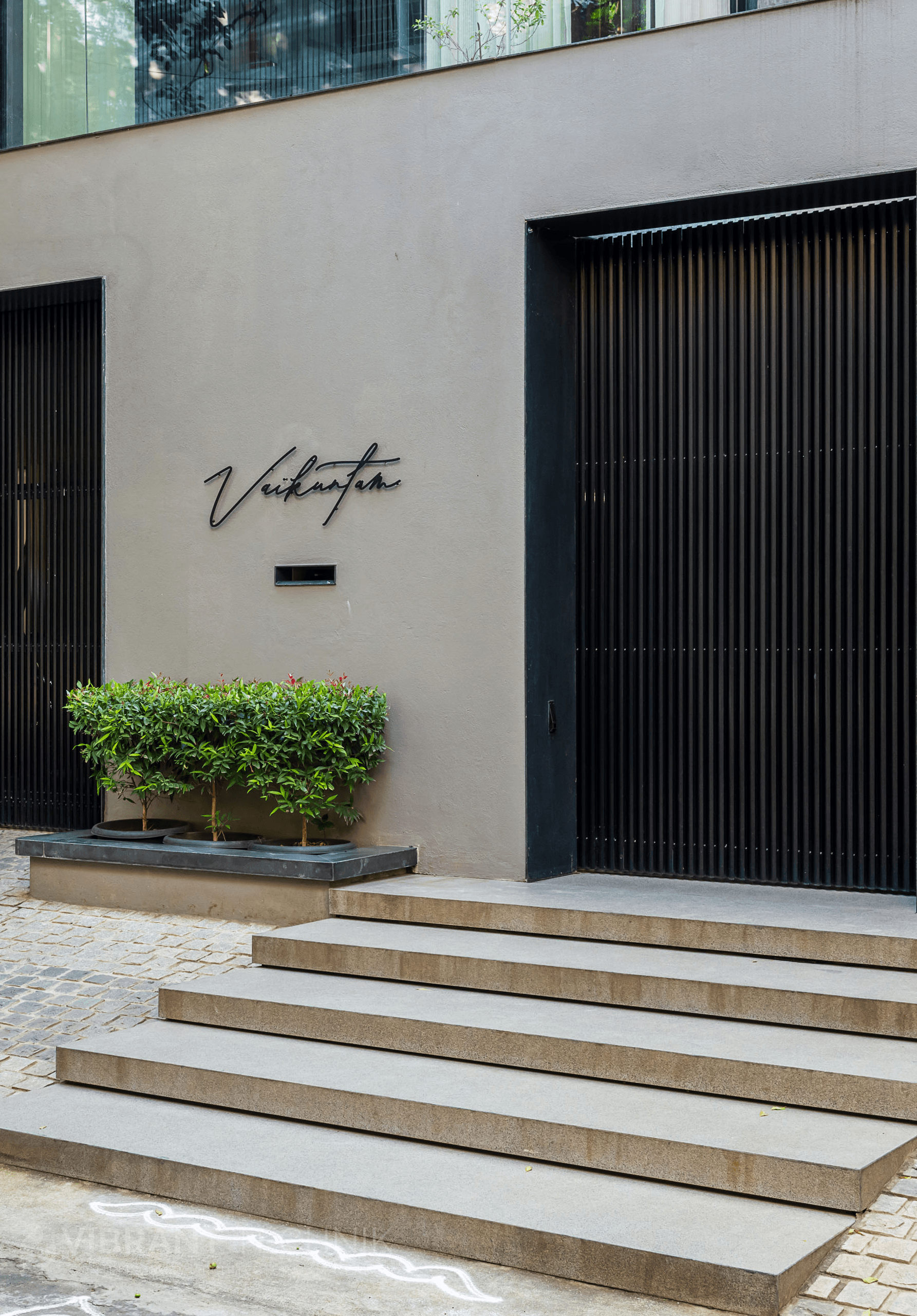 A facade that feels grounded and composed, where slim dark louvers stand in quiet rhythm, filtering light and keeping the home comfortably private without shutting the world out. Through the day, soft shadows move across the surface and the structure feels alive in its own calm way. The result is privacy that feels natural, elegance that arrives effortlessly, and a home that sits with quiet confidence.
