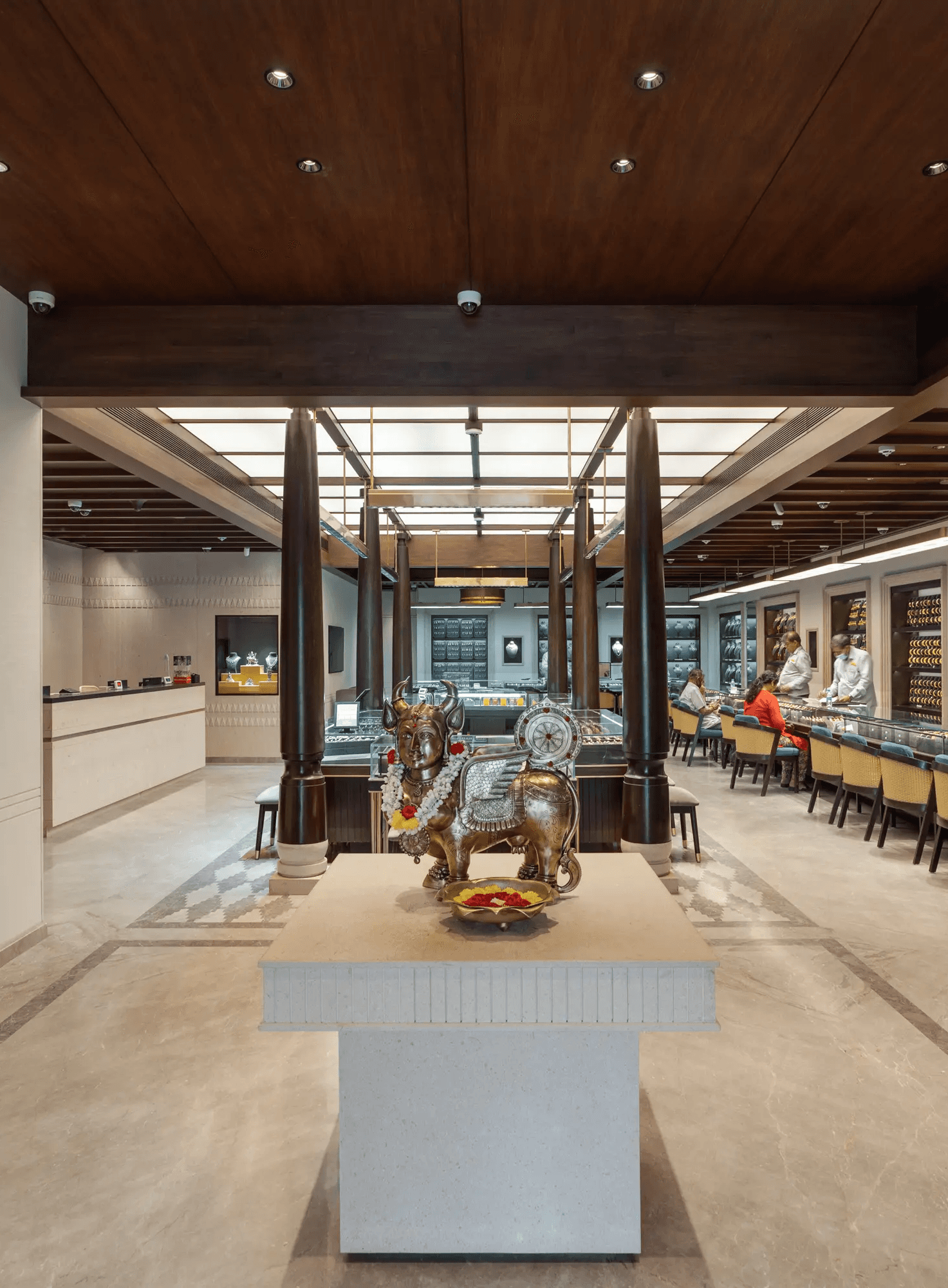 This Chennai showroom is shaped around the idea of the traditional Indian Aangan. Light enters from above and spreads evenly across the space. The ceiling quietly establishes this quality of light, while the structure and materials remain familiar and grounded. The space stays open and composed, creating a setting where display and experience feel natural and unforced.